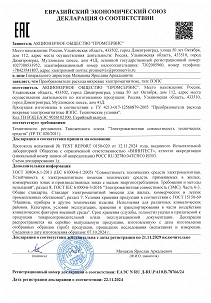 Декларация соответствия ТС № RU Д-ВО.РА10.В.95638/24. Тепловые Пункты. Соответствует Требованиям Технического Регламента Таможенного Союза ТР ТС 020/2011 «Электромагнитная совместимость технических средств», ТР ТС 004/11 «О безопасности низковольтного оборудования». Действительна до 27.11.2029.