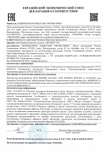 Декларация о соответствии ТС № RU Д-RU.РА03.В.91158/24 «Термоконтроллер «ПРАМЕР-710». Соответствует требованиям ТР ТС 020/2011 «Электромагнитная совместимость технических средств», ТР ТС 004/2011 «О безопасности низковольтного оборудования, срок действия 24.04.2029 г.