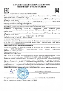 Декларация о соответствии ЕАЭС N RU Д-RU.РА04.В.08668/24 «Электропривод ЭП». Соответствует требованиям технического регламента Таможенного союза ТР ТС 020/2011 «Электромагнитная совместимость технических средств», ТР ТС 004/2011 «О безопасности низковольтного оборудования». Действительна до 29.05.2029 г.