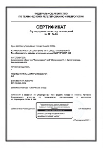 Сертификат об утверждении типа средств измерений «Теплосчетчики ПРАМЕР-ТС-100-К». Госреестр № 75688-19. Срок действия утверждения типа до 26 июля 2029 г.